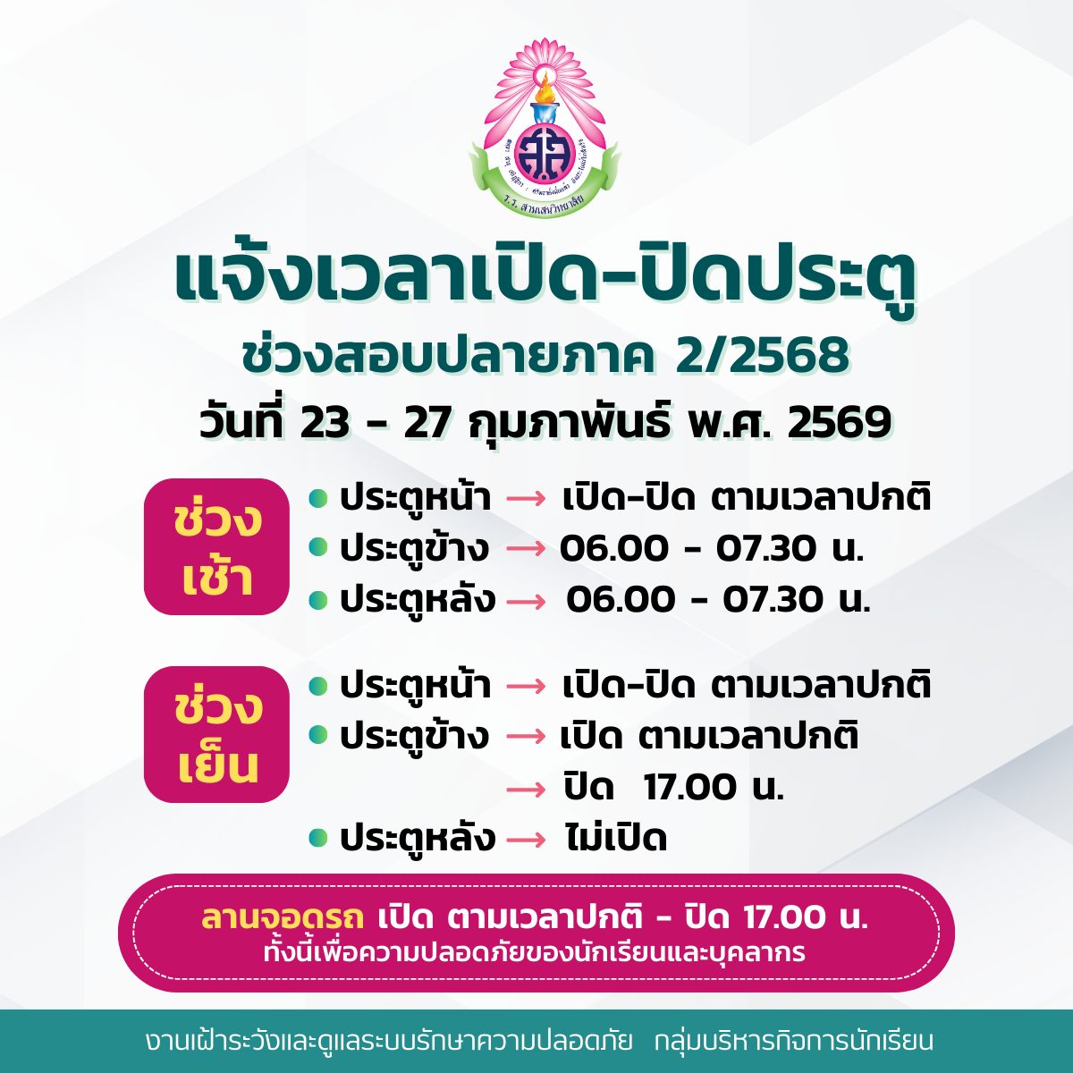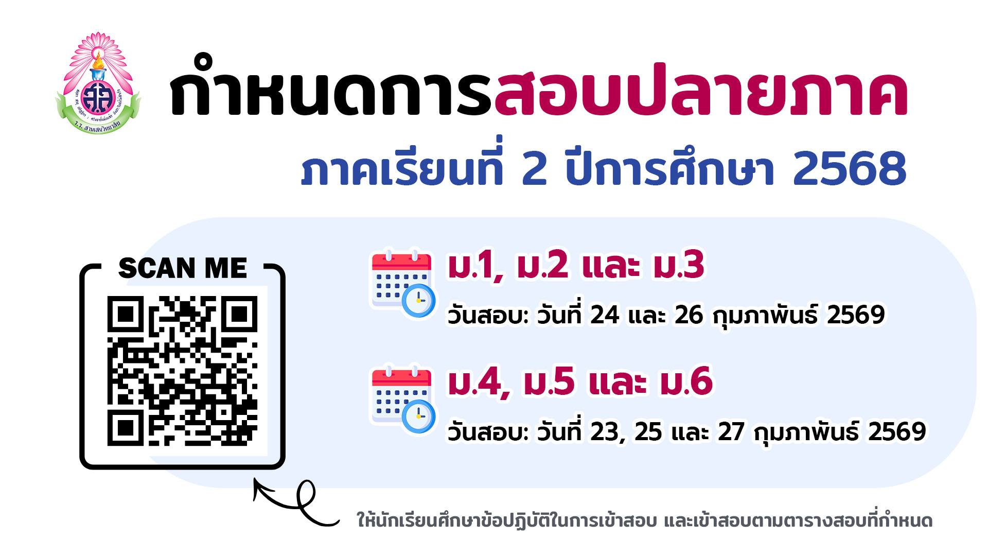 กำหนดการสอบปลายภาค ภาคเรียนที่ 2 ปีการศึกษา 2568 ระดับชั้นมัธยมศึกษาปีที่ 1 – 6 วันที่ 23-27 กุมภาพันธ์ 2569